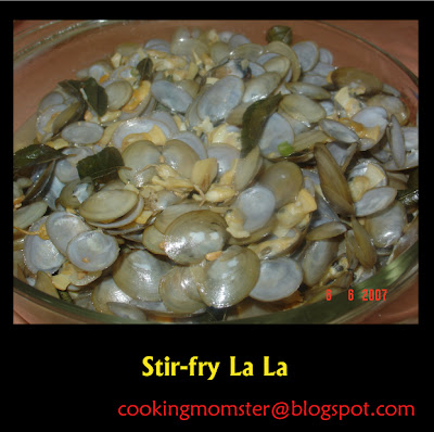 3. Add in the La La and some water. Cover the pan and let it simmer for 10 minutes or until the La La's shells is open up. Dish up and serve.