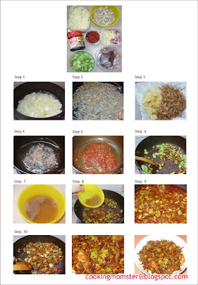 8. Add in the fried potatoes and ikan bilis and stir till well mixed. Dish up and serve hot with rice.