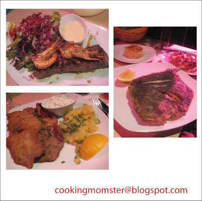 Clockwise from top left : Beef Steak & Grilled Prawns, Pan Fried Fish & Salad, Weiner Schitnzel.